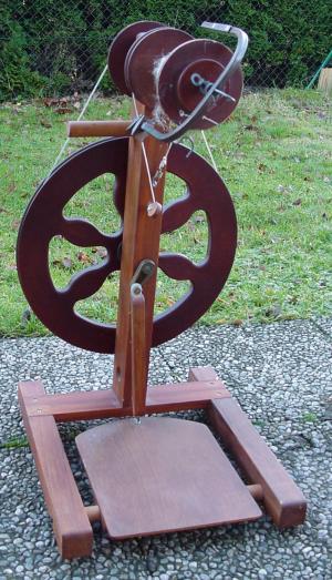 | Dieses Spinnrad stammt aus Neuseeland, wie der Stempel auf der